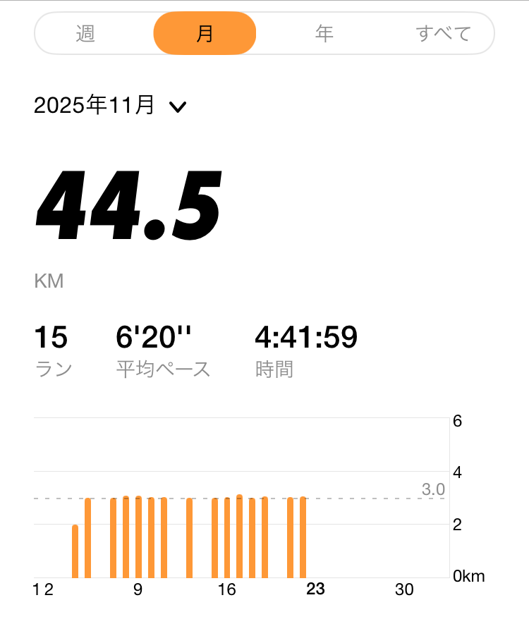こんな感じで、なかなか毎日10キロ走るという目標が果てしなく遠く感じますが、頑張って習慣化したいです。11月の残り期間から12月まで毎日3キロは走りたいです。